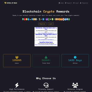 WheelofGold.com (Mining) uses FaucetPay payment method to pay its users, the first payment was sent 1204 days ago. The Mining website is owned by compaqlife and currently has an health score of 100%.